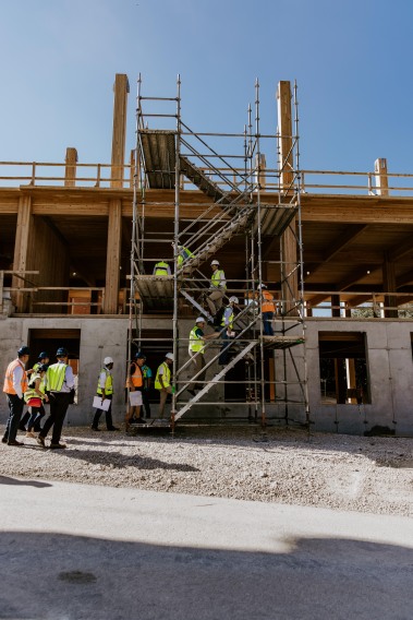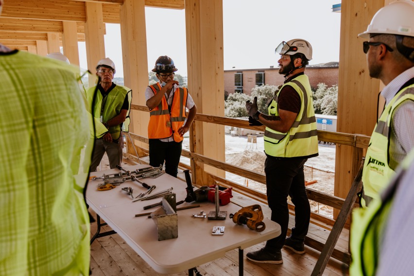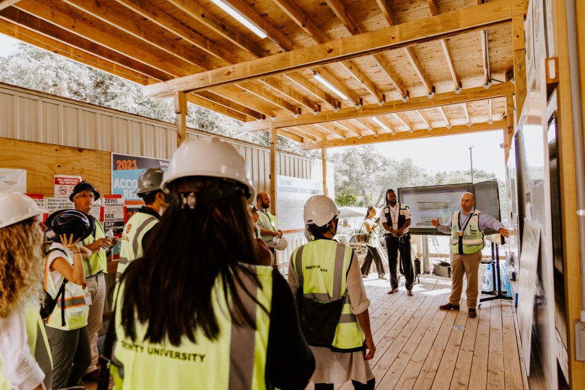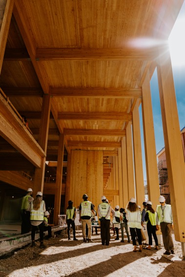 The cross-laminated timber (CLT) used on University Hall is the first of its kind in San Antonio. With R.E ARCH & Works Constructions vast Mass Timber experience, lessons learned from other R.E ARCH & Works Constructions teams around the nation were captured and implemented. As a result, moisture mitigation plans, quality control plans, delivery documentation procedures, and protection protocols were created and implemented. With the gained experience, R.E ARCH & Works Constructions, along with architect partner Lake Flato, were able to host the Mass Timber in 3-2-1 event where clients had the chance to tour University Hall directly after topping out and learn why they should consider building with Mass Timber.